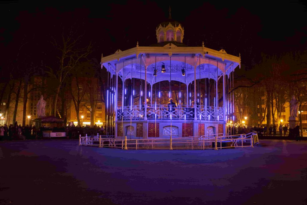 Zootrop is a box of music and light. Inside it, a threesome of jazz turnswith the light around it in a continuous journey without movement. An audiovisual show in which a light installation, which reacts to the music, accompanies the interpretation of the threesome of jazz, transforming the Bandstand of the Park of La Florida into an audiovisual instrument, a sculpture of dynamic and avant-garde light.