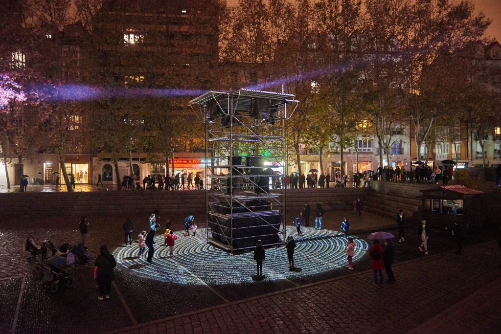 El tiempo es un concepto profundamente arraigado en nosotros desde el nacimiento. Nuestras vidas se organizan en secciones de tiempo estructuradas que nos otorgan un principio y un fin. Esta instalación explora la percepción del tiempo en un sentido sensorial, enfrentando la percepción colectiva y personal del mismo. Jugando a través del movimiento y las sombras, el primero se presenta como una nueva unidad de media mientras que el segundo, como su representación. La luz personifica a un orador público que sin voz se limita a comunicar a través del tiempo y del ritmo, invitando a la audiencia a formar parte de un juego sensorial y de percepción. El tempo se acelera o ralentiza objetivamente, intentando marcar su estructura en la subjetividad del espectador. Una obra diseñada como una invitación a un viaje que ordena reducir la velocidad para tener el tiempo para la contemplación.